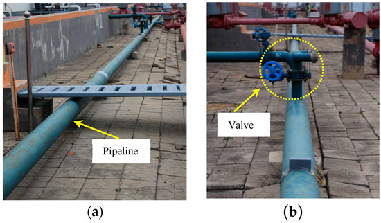 Picture of actual pipeline; (a) pipeline; (b) valve.