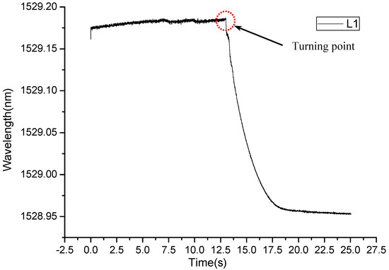 Due to limitations of the water pump, the actual pipeline model cannot simulate the leakage under the flow state. Prior to starting the leakage experiment, the pipeline was filled with water and pressurized to 1.2 MPa. During the leakage experiment, the inner pressure dropped from 1.2 MPa to 0 MPa by opening the valve suddenly. The Micron Optics SM130 (Micron Optics, Inc., Atlanta, GA, USA) was used to demodulate the wavelength of an FBG strain hoop sensor. The sampling rate in this leakage experiment is 1000 Hz. Figure 10 presents the wavelength variation of sensor L1 when the leakage was simulated by opening valve S1. It can be seen that the wavelength remains constant before the leakage occurrence. However, when the leakage happened, the wavelength detected by the FBG strain hoop sensor suddenly declined. This is due to the NPW propagating along the pipeline model, causing the inner pressure to suddenly drop, simultaneously leading to the hoop strain decrease. The time when the turning point (displayed in Figure 10) occurs can be considered as the arrival time of NPW. The experiment results demonstrate that the wavelength detected by the FBG strain hoop sensor can be taken as an effective indicator of leakage occurrence and the FBG strain hoop sensor is suitable for the pipeline leakage monitoring.