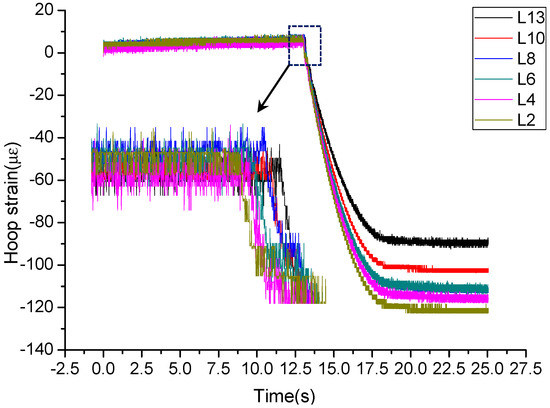 When leakage occurred at S1, the hoop strain variation of six sensors (L2, L4, L6, L8, L10 and L13) with the same interval of 40 m is displayed in Figure 11. Obviously, the last sensor to detect the turning point was L13, which is located the farthest from the leakage point among the six sensors. However, for sensor L2, which is located closest to the leakage point S1 among the six sensors, is the first sensor to detect the turning point. In conclusion, the closer the distance between the leakage point and the sensor, the earlier the turning point occurs. The experiment results demonstrate that NPW propagates along the pipeline model at a certain speed. The time when a turning point occurs can be considered as the arrival time of NPW. Based on the difference in time it takes for the NPW to reach the FBG strain hoop sensors, the leakage location can be calculated. Additionally, it can be seen from Figure 11 that hoop strain variation of different sensors under the same leakage is different, the amplitude of hoop strain variation decreases with the increase of the distance between the leakage point and the FBG strain hoop sensor. This phenomenon illustrates that the NPW energy attenuates gradually when NPW propagates along the pipeline, and perhaps there is a certain relationship between the NPW energy attenuation and its propagation distance. The experimental results suggest that a leakage localization method according to the NPW energy attenuation is worthy of being studied. It can also be concluded from Figure 11 that the method of leakage localization based on the NPW is limited by distance. Therefore, the principle of NPW energy attenuation will be studied comprehensively in the next stage.