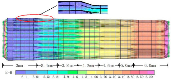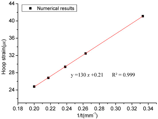 The deformation nephogram generated by the SAP2000 software is shown in Figure 12 and the wall thicknesses are marked by dimensions. To be more explicit, the scaling of nephogram is taken as 2000, and the place circled in red is magnified five times. The numerical results are extracted and displayed in Figure 13. Additionally, the linear equation between the hoop strain and the wall thickness of the numerical model is established. The numerical analytical results show a linear variation of the hoop strain with a regression coefficient over 0.999, which demonstrates that the hoop strain is in inverse proportion to the wall thickness of pipeline strictly. It also can be seen that the pipeline wall extends uniformly and the circumferential deformations of the pipeline decrease according to the rise of the wall thicknesses. The numerical results proved that the corrosion monitoring theory based on hoop strain measurement is valid.