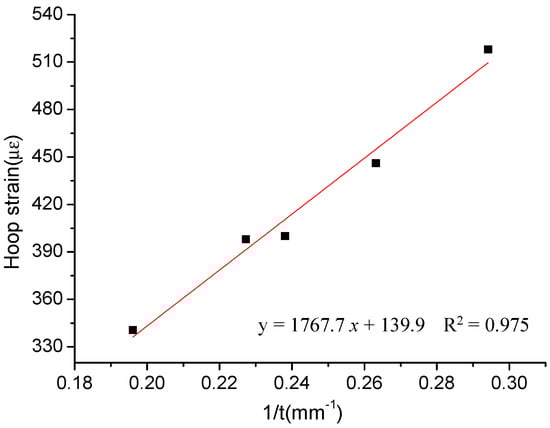 The hoop strain variation measured by five FBG strain hoop sensors is shown in Figure 15. Because PVC is not an absolute linear elastic material, leading to the hoop strain variation under the internal pressure is not extremely linearized. Therefore, the regression coefficient of the linear variations of the FBG strain hoop sensor is 0.975, less than 0.999. Nevertheless, hoop strain variation and wall thickness of the pipeline still present as being an inverse proportion relationship. The hoop strains measured by the FBG strain hoop sensors give the sensitivity 1767 με/mm for the PVC pipeline model, proving that the FBG strain hoop sensors are sensitive to the hoop strain variations caused by corrosion. Therefore, considering the good performance of the FBG strain hoop sensor in the experimental results, the hoop strain measured by the FBG strain hoop sensor can reflect the corrosion degree accurately.