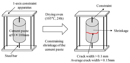 Since the major reaction materials generated during the self-healing of cement-based composite materials are controlled by the hydration reaction between cement particles and water [10], multi-faceted evaluations of the self-healing performance were conducted with test bodies made from cement paste. Figure 2 shows a schematic diagram of the preparation of test bodies and the incorporation of cracks in the present study. First, cement-paste test bodies with a water/cement ratio of 40% were produced from high-strength Portland cement (density: 3.14 g/cm3, average particle diameter: 10 µm). To prevent the dissipation of water from the test bodies, after the cement paste was dispensed into the mold (dimensions: φ50 × 100 mm) with D6 steel reinforcement (diameter: 6 mm) fixed in the center part, the part with exposed steel reinforcement was immediately seal-cured with epoxy for one day in a chamber at a constant temperature of 20 ± 1 °C and constant humidity of 60%. Next, underwater curing was conducted for seven days on the demolded test bodies in a water tank at a temperature of 20 ± 1 °C. Following this, the upper and lower parts of the test body were constrained by using a one-axis constraint apparatus, as shown in Figure 2.
