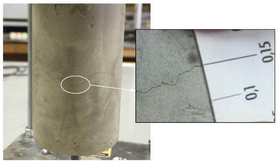 Pre-cracks with an average width of about 0.15 mm were incorporated by drying for about 24 h in an oven at 105 °C, followed by constraining the shrinkage of the cement paste to conduct experiments as a test body “before self-healing.” Figure 3 shows the appearance and scale of a pre-crack measuring about 0.15 mm in the test body.