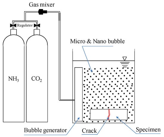 It is thought that the Ca2+ ions in a saturated Ca(OH)2 solution can promote self-healing, and the generation of self-healing precipitated substances can be enhanced through an increase in the quantity of CO32− supplied by CO2 microbubbles during self-healing [26,27]. Therefore, CO32− ions were supplied by ultrafine bubbles to the cracked part in the cement-paste test body to increase the production of self-healing precipitates [1].
