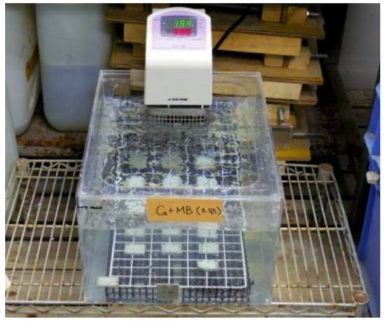 Table 1 shows the sealing-healing factors and conditions employed in the study. The self-healing conditions (temperature and pH) that could control changes in the cement as it is hydrated and transforms from calcite to vaterite were obtained from the literature (Figure 1) [24,25]. The pH was adjusted by bubbling a gas mixture of ammonia (NH3) and carbon dioxide (CO2) into the water. Experiments were also conducted by separating the CO32− ions in the saturated Ca(OH)2 solution (solubility: 0.82 g/L) into microscale (average particle diameter: 50 µm) and nanoscale (average particle diameter: 50 nm) particles. Figure 4 shows a schematic diagram of the self-healing device used in this study, and Figure 5 shows a photograph of the experimental setup using Ca(OH)2 with microbubbles.