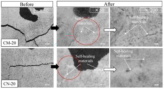 Figure 11 shows the volume change in the section with voids as a function of the pH (9.0, 10.5, and 12.0) before and after self-healing at a constant temperature of 40 °C. The volume changed by about 60% (from 2.41% to 0.89%) in CM-9.0 and by about 85% (from 2.42% to 0.39%) in CN-9.0 when the pH was set at 9.0. When self-healing took place at a pH of 10.5, the volume of the section with voids decreased by about 40% (from 2.22% to 1.34%) in CM-10.5 and by about 60% (from 1.5% to 0.56%) in CN-10.5. When the pH was set at 12.0, the volume of the section with voids decreased by about 45% (from 2.21% to 1.18%) in CM-12.0 and by about 80% (from 0.92% to 0.2%) in CN-12.0. These results indicate that the void volume decreased with a pH in the order of 12.0 > 9.0 > 10.5 at a self-healing temperature of 40 °C; according to the literature, these conditions are known to be advantageous for the generation of vaterite [24]. Furthermore, the volume reduction was about 20%–25% higher in the CN series than in the CM series, indicating that the supply of nanobubbles with CO32− ions was more effective for self-healing than the supply of microbubbles.