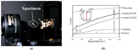 Raman spectroscopy analysis: (a) experimental setup; (b) Raman spectra of self-healing substances generated in test bodies (CM-20, CN-20).