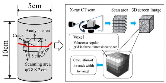 To observe the progression of self-healing inside a crack, the crack interior in a test body was monitored using microfocus X-ray CT scans. An X-ray of 40 µA at 180 kV was employed, and the screen analysis domain for the X-ray CT scans was set as shown in Figure 8. The three-dimensional (3D) images obtained for each test body were composed of voxels, and the crack width and volume of the cracked section were calculated by using these voxels (Figure 8) [28] (While a pixel (short for “picture element”) is defined by a two-dimensional (2D) coordinate and the value of a data point (e.g., luminance, color) at that coordinate, a voxel (short for “volume element”) is defined by a 3D coordinate and the value of a data point (e.g., luminance, color) at that coordinate).