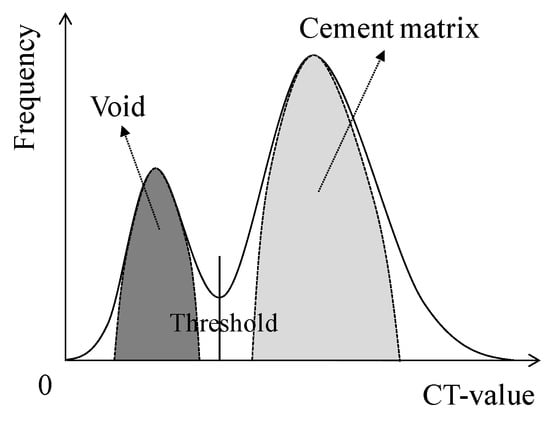 A conceptual histogram of the luminance and frequency of the 3D screen is shown in Figure 9, where the boundary in luminance between a void and the material (cement matrix) is clearly differentiated by the normal distribution of each peak. The total volume of the pores could be calculated because the cracked section before self-healing had the same density as that of the void. The volume changes of the voids in the cracked section before and after self-healing were compared and evaluated by calculating the difference between the density of the section with voids and that of the section filled by precipitates.