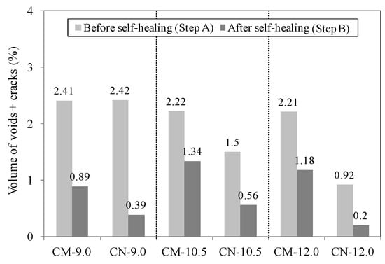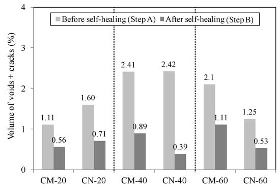 The volume change recorded in the section with voids before and after self-healing in each test body are shown in Figure 10 as a function of the self-healing temperature (20, 40, and 60 °C) at a constant pH of 9.0. A comparison of the volume after step B with the volume after step A shows that the volume of the section with voids decreased in both test bodies after self-healing at 20 °C, dropping by about 50% (from 1.11% to 0.56%) in CM-20 and by about 60% (from 1.60% to 0.71%) in CN-20. When self-healing took place at 40 °C, the section with voids also decreased in volume by about 65% (from 2.41% to 0.89%) in CM-40 and by about 85% (from 2.42% to 0.39%) in CN-40. After self-healing at 60 °C, the volume of the section with voids decreased by about 40% (from 2.1% to 1.11%) in CM-60 and by about 60% (from 1.25% to 0.53%) in CN-60. These results show that the volume of the section with voids experienced 15%–20% more reduction in the CN series than in the CM series, and the reduction rate of the volume of the section with voids decreased with a self-healing temperature in the order of 40 > 20 > 60 for all series. Therefore, the supply of nanobubbles was more advantageous for self-healing (CN series) than the supply of microbubbles (CM series), and the self-healing temperature of 40 °C was more advantageous than the temperatures of 20 and 60 °C.