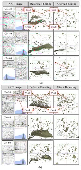 X-ray CT images of cracks before and after self-healing at different temperatures and a fixed pH of 9.0: (a) CM series; (b) CN series.