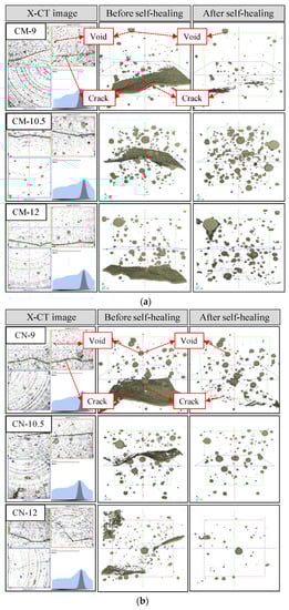 X-ray CT images of cracks before and after self-healing at different pH values and a constant temperature of 40 °C: (a) CM series; (b) CN series.