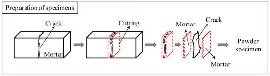 TG-DTA was carried out to quantitatively analyze the types and amounts of Ca(OH)2 and CaCO3 precipitated by self-healing on the surface and interior of cracks. The cracked section was almost severed from the cement matrix, as illustrated in Figure 14, and TG-DTA specimens were only collected from the cracked section of each test body.