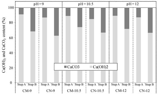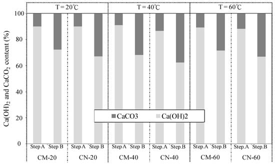 Figure 15 and Figure 16 show the Ca(OH)2 and CaCO3 content in the cracked section before self-healing (step A) and after self-healing (step B) as functions of the self-healing temperature (20, 40, and 60 °C; constant pH of 9.0) and pH (9.0, 10.5, and 12.0; constant temperature of 40 °C).