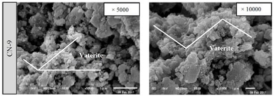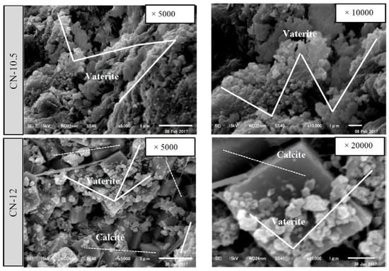 To check for the possibility of generating vaterite as a denser calcium carbonate crystal and controlling its formation by regulating the temperature or pH, SEM analysis was conducted on the CN series of test bodies under each self-healing condition. The SEM with a probe diameter of 0.5–5 µm was operated at an accelerating voltage of 15 kV. Figure 17 and Figure 18 show SEM images of self-healing precipitates generated at different temperatures (20, 40, and 60 °C) and pH values (9.0, 10.5, and 12.0). The images suggest that calcite was formed at 20 °C, vaterite was formed at 40 °C, and aragonite was formed at 60 °C when the pH was set at 9.0 (Figure 17) [24,25,29]. These values represent the optimum temperature for generating a large amount of vaterite; they also suggest that the type of CaCO3 crystals can be controlled by changing the self-healing temperature. Although the generation of vaterite was affirmed in all cases, the pH value is believed to have some effect on the CaCO3 crystals when the self-healing temperature was kept constant at 40 °C (Figure 18) [24,29]. The current experimental results suggest that temperature had a greater effect than pH on the type of CaCO3 crystals generated during self-healing. In particular, for the sample CN-40-9.0 (immersed in Ca(OH)2 solution with a temperature of 40 °C and pH of 9.0), Ca(OH)2 was not observed among the hydrated products, and the amount of generated vaterite attached to the surface was the largest, along with a large amount of C–S–H gel. Hence, based on the findings of reported studies, the controlled generation of vaterite as a denser crystal was possible by setting the temperature to 40 °C and the pH to 9.0 [24,25].