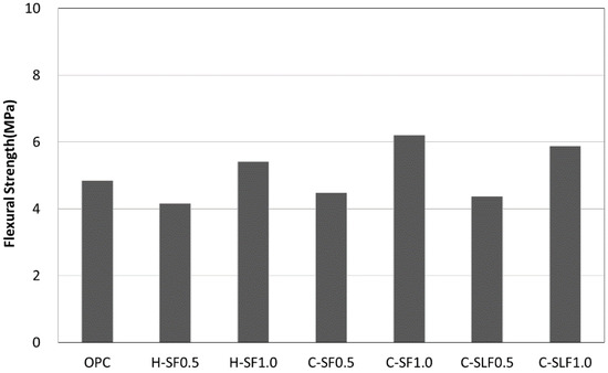 Shown in Figure 2 are the flexural strength results of all the specimens. The specimen mixed with 0.5% steel fiber showed 8–14% strength reduction compared to the ordinary Portland cement (OPC) specimen, and the specimen with 1.0% steel fiber showed 11–28% improved strength compared to the OPC specimen. The specimen with 0.5% steel fiber, however, showed a strength reduction rate within the error range of the strength of the OPC specimen, and the other specimen with 1.0% steel fiber showed some degree of improvement by mix.