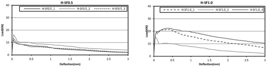 The third section was the zone where the load displacement curve increased after the load reduction due to the interaction between the steel fiber and the concrete, and the increase in the amount of fiber mixed with the concrete resulted in increases in the amount of energy absorbed. The load reascension effect was not shown, however, in the H-SF with 0.5% steel fiber (Figure 10).