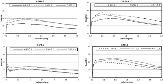 The load displacement curve of the steel fiber-reinforced concrete illustrated that with fiber mix, the concrete after failure would show a rapid load decline, a gentle load decline, or a smooth load increase depending on the fiber bridging capacity. Different remaining loads and toughness variation resulted from the pullout resistance effect of steel fiber, and generally, the increase in the fiber content tended to show a marked increase in the remaining load and toughness. It is believed that this was because, in the load transfer process to the steel fiber after the initial concrete matrix cracked, the steel fiber under load delayed the cracks as it went through the process of load bridging, pullout and fracture [19,20,21,22,23]. It is also believed that this was because after the brittle failure of the concrete, it was the steel fiber that affected the behavior of the specimens, and therefore, the behavior of the load displacement graph after the first peak load changed depending on the shape and type of the steel fiber. The test verified that C-SF and C-SLF showed superior remaining load and toughness in all the fiber contents with H-SF, which is manufactured through the thin-plate cutting method.