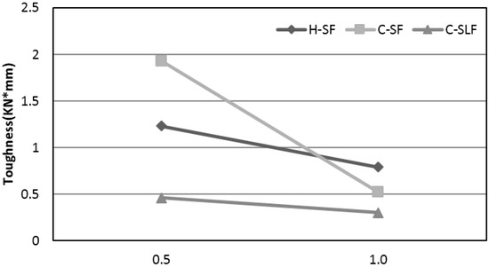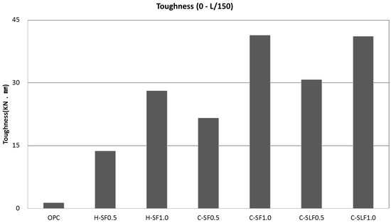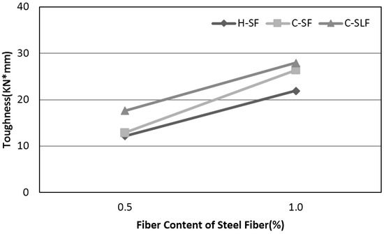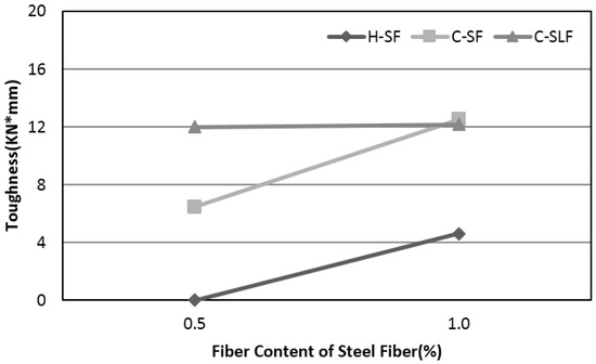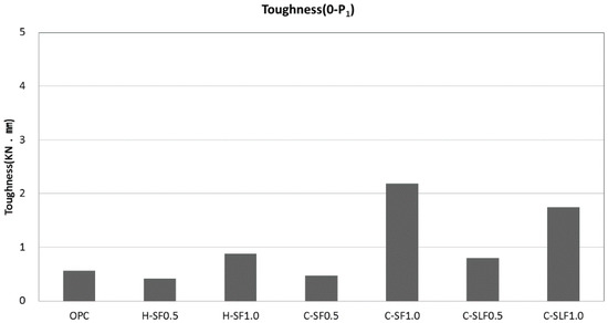 Figure 4 shows the area up to the first peak load of the specimen, and Figure 5 shows the overall toughness. Although there was a small difference in toughness among the specimens up to the point of concrete matrix failure, as shown by the failure mechanism of steel fiber-reinforced concrete, a drastic increase in toughness was identified when the fiber behavior section was included. The overall toughness of the steel fiber-reinforced concrete (H-SF, C-SF and C-SLF) drastically increased compared to that of the ordinary Portland concrete (OPC), but the toughness of the specimens with 1.0% steel fiber was shown to have improved by 30–100% compared to that of the specimens with 0.5% steel fiber. In the case of the H-SF and C-SF specimens, the toughness of those with a 0.5% steel fiber content was 13.76 and 21.63 KN-mm, respectively, and that of those with a 1.0% steel fiber content was 28.11 and 41.36 KN-mm, respectively, demonstrating that the C-SF specimens with crimped steel fiber exhibited superior toughness compared to the H-SF specimens. C-SLF showed a higher energy absorption property than the H-SF and C-SF specimens in all the fiber contents.