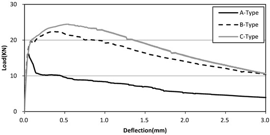 As shown in Figure 6, three different behavioral types of the load displacement curve of the steel fiber-reinforced concrete were identified from the analysis of the flexural behavior characteristics, from which some principles among the fiber contents, material properties, and the load displacement curve were derived. First, the smaller the fiber content and the lower the tensile strength of the fiber, the wider and more drastic the load reduction that was detected in the section where the load was reduced after the first peak load was reached (type A). Second, the greater the increase in the fiber content and the higher the tensile strength of the fiber , the longer the load displacement curve increased over the first peak load after a slight load decline (type B). Finally, after the cracking of the concrete matrix, the load transfer to the fiber increased nonlinearly, without any load reduction (type C).