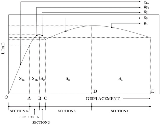 For a detailed analysis of the flexural behavior characteristics, the curve was divided into zones based on the load transfer type. First, as with the other toughness assessment methods, the point at which brittle fracture occurred on the load deflection curve was considered the first peak load point, and the section was set to the first section (sections 1a and 1b). Section 1a was the zone where the concrete matrix exhibited elastic behavior, and Section 1b was the zone where fine cracks occurred with curved behavior up to the first peak point. These two sections were separated from each other based on the fact that the elastic behavior of the material showed a straight line. When a linear regression curve of a linear equation (y = ax) was applied to the load displacement graph, the maximum displacement in which the coefficient of determinant to the actual load displacement graph was 0.99 or higher was set as the end of section 1a, and the curved-behavior zone from the end of section 1a to the first peak load point was set as section 1b. The second section was the load reduction zone caused by the different material properties in the load transfer process to the steel fiber after the first peak load. The third section was the load reascending zone due to the interaction between the steel fiber and the surface to which the concrete was attached, which was from the end of the second section to the second peak load point. The fourth section was the zone where load reduction occurred as the remaining load was gradually dissipated, which was from the end of the second section if the third section did not exist, or from the end of the third section to 2.0, the end point of the overall toughness. Shown in Table 5 is a summary of the range of each section, and Figure 7 shows the diagram of the slope and area (toughness) by section.