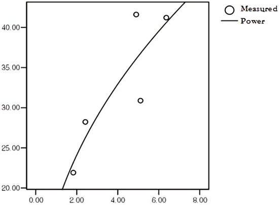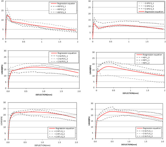 The regression analysis targeted a total of six types of steel fiber-reinforced concrete, and due to the characteristics of the regression curve in which the nonlinear and linear zones coexisted, the standard equation was a quadratic equation (Equation (1)).