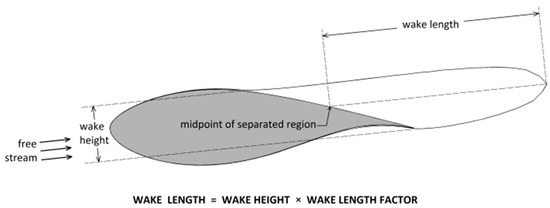 In the late 1970s, Maskew and Dvorak [28] developed a 2D panel method to calculate the flow field around airfoils for angles of attack up to and beyond stall. They treated the separated wake as a region of “constant total pressure bounded by [a pair of] free shear layers” [29]; ergo, this method is typically referred to in the literature as the “double wake” method. Because “the position of the vortex sheets representing the free shear layers is not known a priori” [30], the initial wake shape is “represented by parabolic curves passing from the separation points to a common point [...] on the mean wake line, distance WL downstream from the wake midpoint” [31] (Figure 2). WL, the wake length, is based on a wake length factor, WF ≡ 0.081 × c/t + 1.1 [32], which follows an empirical relationship between the extent of separation (represented as “wake height”) and the thickness-to- chord ratio. The wake panels are then iteratively reoriented until the normal velocities on all wake panels converge to within a tolerance of “1% of the free stream velocity” [29]. However, this approach is complicated by the laborious solution of the off-body induced velocity field and the pressure jump in the separated wake. These extraneous calculations are not necessary within the current method and are therefore not covered in the present paper.