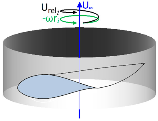 The separation points are determined via the 2D boundary layer analysis of Section 2.2, applied in the axial and tangential directions. The thick wake method then adopts the initial wake geometry illustrated in Figure 2, transformed to cylindrical coordinates, such that the undisturbed relative flow velocity U rel is equal to the vector sum of the free stream velocity U and the rotor’s local rotational velocity –ωri (Figure 3), and the wake length WL is a helical arc aligned with the relative flow. The wake shape, which is constrained in the ξ- (parallel with U rel ) and η- (spanwise) directions, is then adjusted according to the local pressure values, Equation (6), by moving the ith wake panel vertex in the ζ-direction (perpendicular to U rel ) from position ζ i n to ζ i n + 1 , as calculated by the nth iteration of the following Quasi-Newton method: