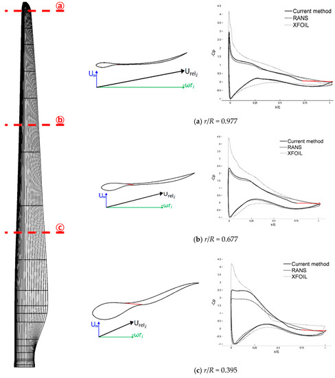 Moving inward toward the root, however, ωri decreases with decreasing ri, as is clearly illustrated by the velocity vectors in Figure 6, resulting in higher angles of attack, and, consequently, more severe separation. Furthermore, the increased angles of attack combined with increased thickness-to-chord ratios result in a thicker separated wake, and, therefore, a more marked transition from displacement body streamline to separation streamline, which further exacerbates the adverse pressure gradient responsible for flow separation. The slight discrepancy between the pressure data predicted by the current method and that predicted by the RANS solver highlights the difficulty of numerically simulating a separated flow behind a rotating body. Of course, it is important to note that, despite a vast body of work on the accuracy and limitations of the RANS equations closed by appropriate turbulence models for the resolution of the turbulent boundary layer along wind turbine rotor blades, without corroborating experimental data, we cannot comment on the real-world accuracy of the compared RANS data, which therefore serve merely as code-to-code comparison. With this in mind, the current method’s predictions are considered highly satisfactory, especially in light of the substantial reduction in computational expense afforded by the current method, which employed around 2000 quadrilateral panels compared to the one million polyhedral cells employed by the RANS model.