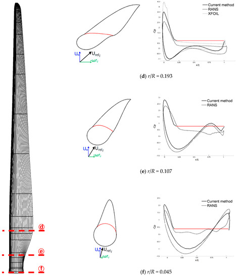 Finally, along the structural inboard region of the rotor, the flow has completely separated, with predicted separation regions at the innermost aerodynamic section (Figure 6d), transitional section (Figure 6e), and cylindrical section (Figure 6f) of 77%, 78.5%, and 84%, respectively, and an apparently proportional increase in the thickness of the separated wakes. At these inboard sections, the thick wakes appear to be well aligned with U rel , although any variations in wake orientation are far less prominent due to the substantial thickness of the wakes. Despite the severe flow separation, the current method’s predicted pressure data is still highly comparable with the RANS data, with a slightly conservative 19% greater pressure differential at the innermost aerodynamic section, compared with Xfoil’s 46%, and just 4% and 2% greater pressure differentials at the transitional and cylindrical sections, respectively, at which Xfoil was unable to produce converged solutions.