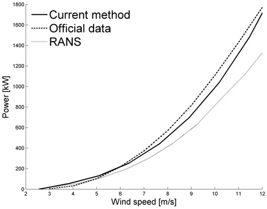 As an additional validation, the output power was computed for a range of wind speeds and wind turbine rotational speeds, from cut-in to nominal. (Nominal wind speed and rotational speed for the target turbine are, respectively, 13 m/s and 20 rpm. Due to a lack of data, a linear relationship was assumed between the wind speed and rotational speed.) The wind speed–power curve predicted by the current method was found to be more conservative than that predicted by the commercial RANS solver, but marginally lower than that provided by the turbine manufacturer, with just a 3% difference between output power at nominal wind speed and rotational speed, compared with the RANS solver’s 13% lower output power at the same conditions (See Figure 7 and Table 2).