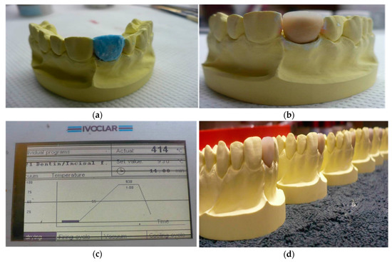Aspects from the preparation of the samples: (a) adding the ceramic material on the copings, before sintering in blue color and larger than the (b) sample after its sintering in the oven (which also displays a change in color); (c) temperature chart displayed by the dental ceramic oven; (d) several samples used in this study.