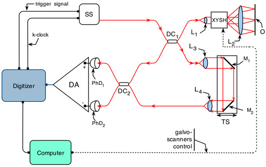 The interferometer configuration employs two single mode directional couplers, DC1 and DC2. DC1 has a ratio of 20:80 and DC2 is a balanced splitter, 50:50. DC2 feeds a balance detection receiver from (Thorlabs, Newton, NJ, USA, model PDB460C), using two photo-detectors, PD1 and PD2 and a differential amplifier DA. Twenty percent from the SS power is launched towards the object arm via lens L1 (focal length 15 mm), which collimates the beam towards a pair of galvoscanners XYSH, (Cambridge Technology, Bedford, MA, USA, model 6115) followed by a scanning lens, L2, (25 mm focal length), which focuses the light on the sample. The optical fibers used, as well as the lenses L1 and L2, determine a lateral resolution of ~10 µm. The power to the object O is 2.2 mW. At the other output of DC1, 80% from the SS power is directed along the reference path via two flat mirrors, M1 and M2, both placed on a translation stage, TS to adjust the optical path difference (OPD) in the interferometer. Collimating lenses L3 and L4 are similar to L1. The signal from the differential amplifier, DA, is sent to one of the two inputs of a dual input digitizer (Alazartech, Quebec, QC, Canada, model ATS9350, 500 MB/s). The acquired channeled spectra are manipulated via a program implemented in LabVIEW 2013 (National Instruments Corporation, Austin, TX, USA), 64 bit, deployed on a PC equipped with an Intel Xeon processing unit (Santa Clara, CA, USA), model E5646 (clock speed 2.4 GHz, 6 cores). The same program is also used to drive the two galvoscanners via a data acquisition board (model PCI 6110, National Instruments Corporation, Austin, TX, USA). Each B-scan image was built of 500 A-scans; hence, with 100 kHz sweeping speed, 10 ms were required to acquire data for a B-scan (the fast galvoscanner was driven with a triangular wave-form [35]). As a consequence, 500 × 500 channeled spectra to build an entire 3D volume and also deliver the en-face images were acquired in 5 s. Once the full dataset was acquired, en-face images were produced using the MS protocol by comparing the signal delivered by the DA with the signal delivered by the DA when a mirror was used as a sample, for an optical path difference in the interferometer adjusted to zen-face, i.e., to 0.75 mm.