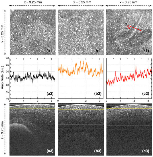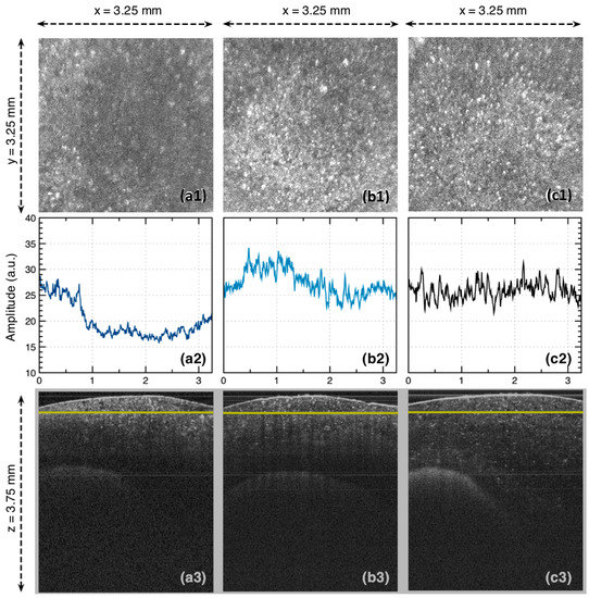 OCT images for the samples obtained at lower than normal temperature in comparison with samples at normal temperature: column (a): Group L100; column (b): Group L30; column (c): Group N. Top row: en-face OCT images of samples of Group L100 (a1), Group L30 (b1), and Group N (c1). Middle row, (a2–c2): reflectivity average of the 500 horizontal lines making the images shown in the top row. Bottom row, (a3–c3): B-scans OCT images corresponding to the three groups. The yellow lines indicate the depth position from where the en-face images were rendered (measured from the zero OPD).