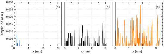 Average of 500 horizontal lines of the en-face images, corresponding to sintering temperatures of (a) 830 °C (Group L100); (b) 930 °C (Group N) and (c) 960 °C (Group H50), i.e., the normal and the extreme temperature considered. The number of peaks in each plot indicates the number of “bright particles”, while their amplitude indicates their size.
