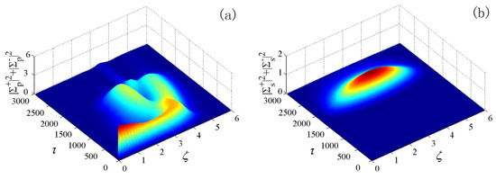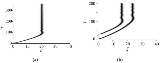(a) The evolution of the population inversion, W, illustrating the creation of an oscillatory standing soliton in the RABR from a sech-shaped input. The pulse width is τ0 = 0.5τc, and the injected amplitude is ; (b) The generation of two standing oscillatory solitons, with the pulse widths τ0 = 0.5τc and injected amplitude [12].