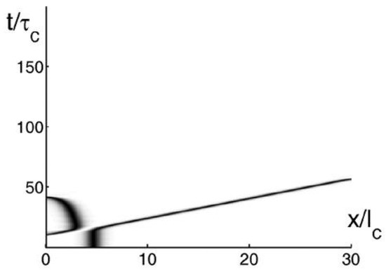 A contour plot illustrating the release of a laser pulse stored in the RABR by dint of its collision with an additional pulse injected into the structure [13]. The pulse width is τ0 = 0.5τc, and the injected amplitude is , for the stopped pulse, and for the incident one. Both input pulses have a standard sech profile.