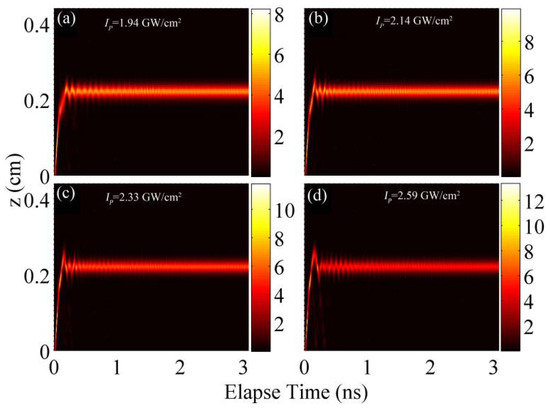 Simulations of the pulse propagation in the concatenated BG, with a defect located at the conjunction of the chirped and uniform segments, for different injected peak intensities: (a) 1.94 GW/cm2; (b) 2.14 GW/cm2; (c) 2.33 GW/cm2; and (d) 2.59 GW/cm2 [14].