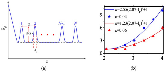 (a) A schematic of the system, built of the linearly chirped BG segment (on the left-hand side) followed by the uniform grating with an inserted periodic array of local defects. The system can be described by parameters (S; dw; ε), and the definition of S, dw, and ε are shown in (a); (b) Relations between the trapping position and the initial pulse’s intensity IP for (S; dw; ε) = (0.132 cm; 50 μm; 0.04) and (0.132 cm; 50 μm; 0.06) (blue and red curves, respectively) [15].
