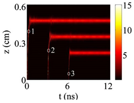 The simulation result of the trapping of three pulses in the BG structure. Here (S; dw; ε) = (0.132 cm; 50 μm; 0.04). The peak intensities of the three pulses are 3.04, 2.78, and 2.07 GW/cm2. Such pulses are launched into the gratings at t = 0, t = 3, and t = 6 ns, respectively [15].