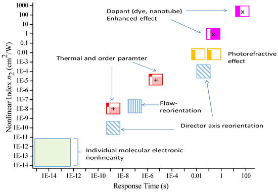 In liquid crystals, the underlying mechanisms generally fall into two classes, as depicted in Figure 11 for the nematic phase (which include the chiral nematic phase often called cholesteric liquid crystals (CLCs)): (i) Macroscopic crystalline responses including the director axis, reorientation by light fields or a light/DC field induced photorefractive effect, index/birefringence change by laser induced order parameter and/or temperature changes, and flow reorientation; these bulk effects generally respond in the millisecond to a sub-microsecond regime [62]; and (ii) Individual molecule’s nonlinear polarization associated with single- and multiple photonic transitions within the molecular energy levels; these respond on the sub-picoseconds to a femtoseconds scale [63,64,65,66,67].
