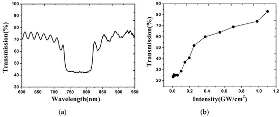 (a) Observed transmission spectrum of linearly polarized light through the CLC cell used in the experiment; (b) Observed dependence of the transmission of a left-handed circularly polarized laser pulse (λ = 815 nm) on the peak intensity [17].