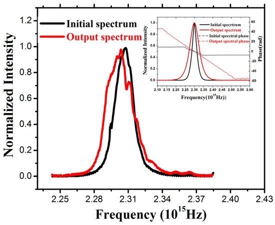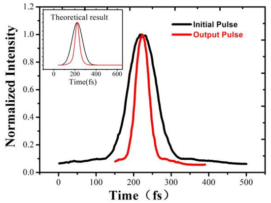 Observed direct pulse compression effect on an initial transform-limited 100 fs pulse (black line) to a 48 fs output pulse (red line); the inset figure corresponds to the simulation results using the measured experimental parameters [17].