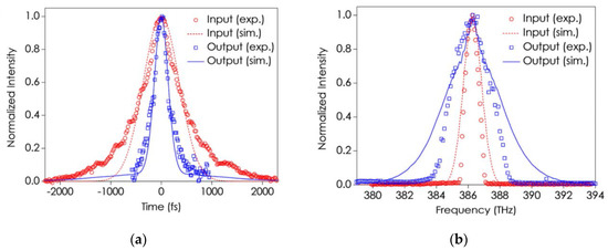 (a) Observed direct pulse compression effect on an initial transform-limited 847 fs pulse (open circles) to a 286 fs output pulse (open squares); the inset figure corresponds to the simulation results using the measured experimental parameters; (b) Observed and simulated spectra for the input and output (compressed) pulses [18].