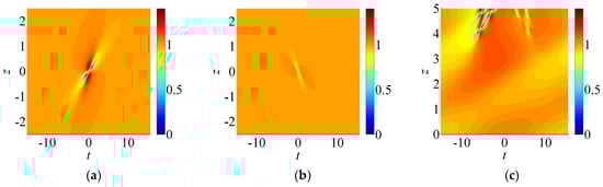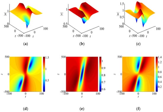 Moreover, the incorporation of the third component increases the complexity of the geometry of the wave profiles. Analytically, the dispersion relation is expressed as a higher order algebraic polynomial and will allow multiple rogue wave solutions under the same input physical parameters. From Equation (3), if a + ib is a root of the dispersion relation, then a − ib will also be admissible and provides another rogue wave solution. This phenomenon was also observed in other multi-component system [38,39,40,41]. Such multi-rogue-wave scenarios are not allowed in the two-component Manakov system.