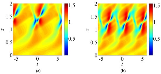 The maximum amplitude can be greater than (Figure 1a), which is the upper bound of amplitude for the two-component Manakov system [31]. Similar increment in amplitude due to coupling was also found in other coupled systems such as the long wave-short wave resonance model with two short wave components [41] and a system of coupled derivative nonlinear Schrödinger equations [38].