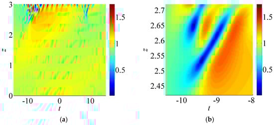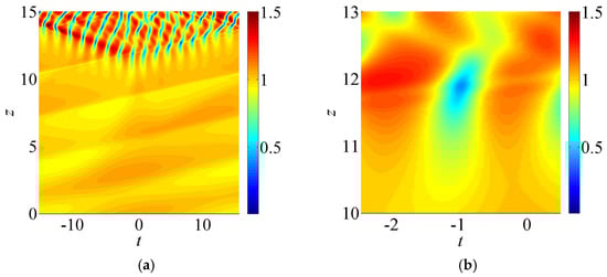 Breathers can be generated through these simulations by starting with a disturbance of higher frequency in the unstable band. For typical values of σ = 10, ρ = 1 and δ = 5, there exist two pairs of complex conjugate roots for Equation (5) at the baseband and the instability growth rates are identical. Two breathers can be generated concurrently and superposition leads to an asymmetric breather (Figure 4). For most rogue waves studied in the literature, the local extrema are usually symmetric with respect to the main displacement and attain the same value. For an asymmetric rogue wave or breather [27,44], symmetry is broken, e.g., the four-petal arrangement is destroyed and one of the minimum points splits into two minima (Figure 4a).