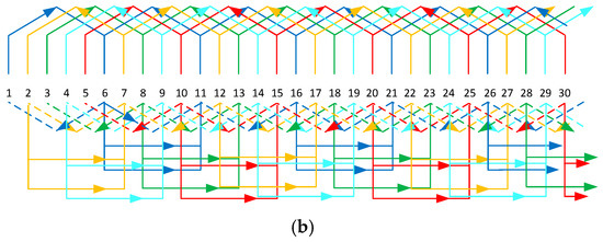 FEM model of the analyzed machine. (a) Layout of the machine. (b) Half winding of the five-phase 60-slots machine with a double layer and constant pitch with q = 1.