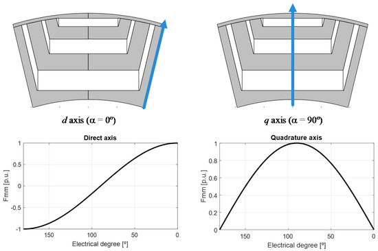Direct (d) and quadrature (q) axes and the mmf (magneto-motive force) as a function of the electrical angle of a SynRM.