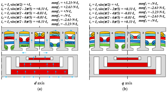 One pole of a five-phase fPMa-SynRM positioned in the direct (d) and quadrature (q) axes and the mmf distribution. (a) d-axis position. (b) q-axis position.